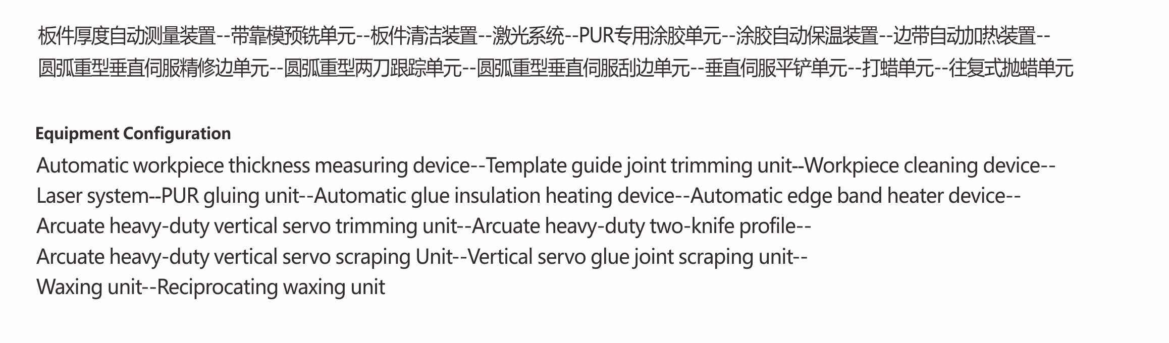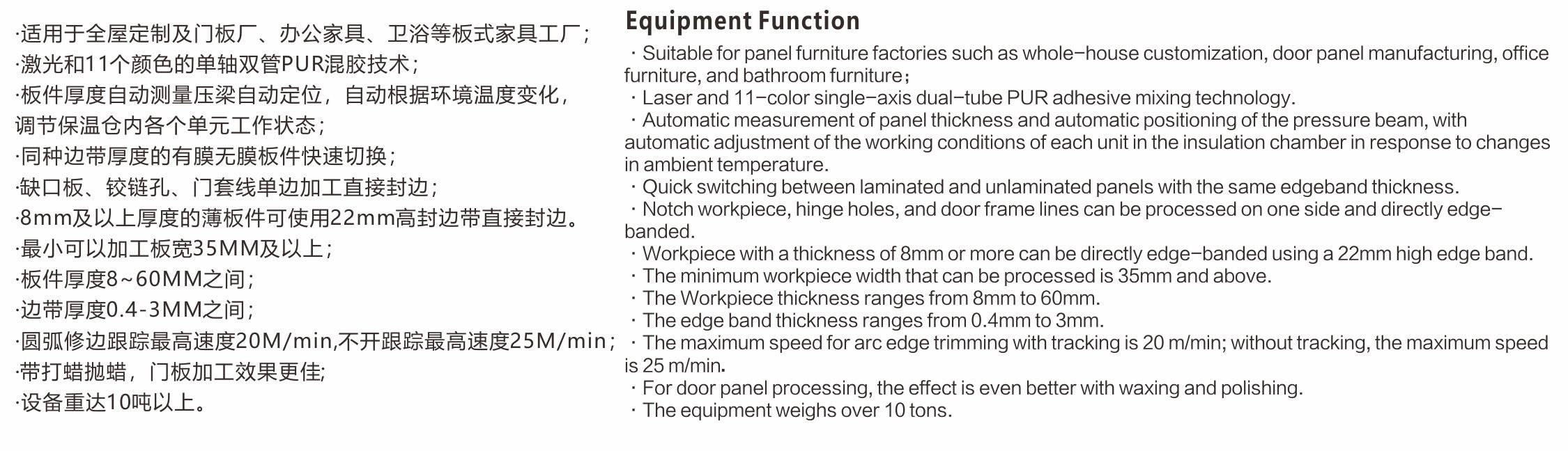 ·適用于板式全屋定制及辦公家具工廠門板、柜體的PVC、ABS、亞克力、木皮等封邊材質(zhì),寬度在35MM及以上,厚度8~60MM之間的板件加工。 ·自動測量板件厚度誤差變化,調(diào)節(jié)最合適的壓梁高度;封邊帶厚度自動測量,根據(jù)封邊帶厚度誤差變化自動調(diào)節(jié)修邊、跟蹤、刮刀各個單元刀具的加工量;預銑單元刀具伺服自動升降,大大提高了預銑刀使用壽命和工作效率;送帶、壓貼伺服驅(qū)動,壓帶、修邊、跟蹤、刮刀、平鏟等單元伺服快速調(diào)節(jié)。板件基材待涂膠面徹底清理后涂膠,避免涂膠軸上頻繁出現(xiàn)殘渣導致涂膠不均勻從而影響封邊效果,送帶壓貼各個單元工作精度高,有膜無膜板件快速切換及不同膜厚度的快速自動補償。加工速度最高可達25M/min,重型伺服兩刀跟蹤最高速度可達20米M/min,可以一次完成板件的圓弧直線封邊和后續(xù)打蠟拋蠟保護。 ·自帶恒溫房更加節(jié)能先進的第二代豪田激光封邊系統(tǒng),免去客戶自己搭空調(diào)房的高能耗、高成本及移動設備位置改變空間布局的不便,同時減少占地空間,可以實現(xiàn)對激光封邊帶的無縫封邊完美加工。 ·一組單軸雙管多色PUR專用伺服免清洗涂膠系統(tǒng),可以根據(jù)封邊帶的顏色變化自動切換最合適的膠水顏色,根據(jù)不同基材的變化實時調(diào)節(jié)涂膠量大小。具備夏季膠水快速降溫,冬季板材、膠水、封邊帶及加工過程加溫保溫功能,為PUR不同氣候溫度下正常工作保駕護航。 ·機架采用加厚鋼板焊接制作,經(jīng)過退火銑平處理,上下鋼梁且下鋼梁及導軌與機身一體化設計精度更高,單元設計重型化長期工作穩(wěn)定性更高,擁有多項國家專利技術(shù),電氣零部件采用國際國內(nèi)知名品牌,保證設備運行持續(xù)穩(wěn)定,加工品質(zhì)完美。 ·重達10噸以上的重型設備。