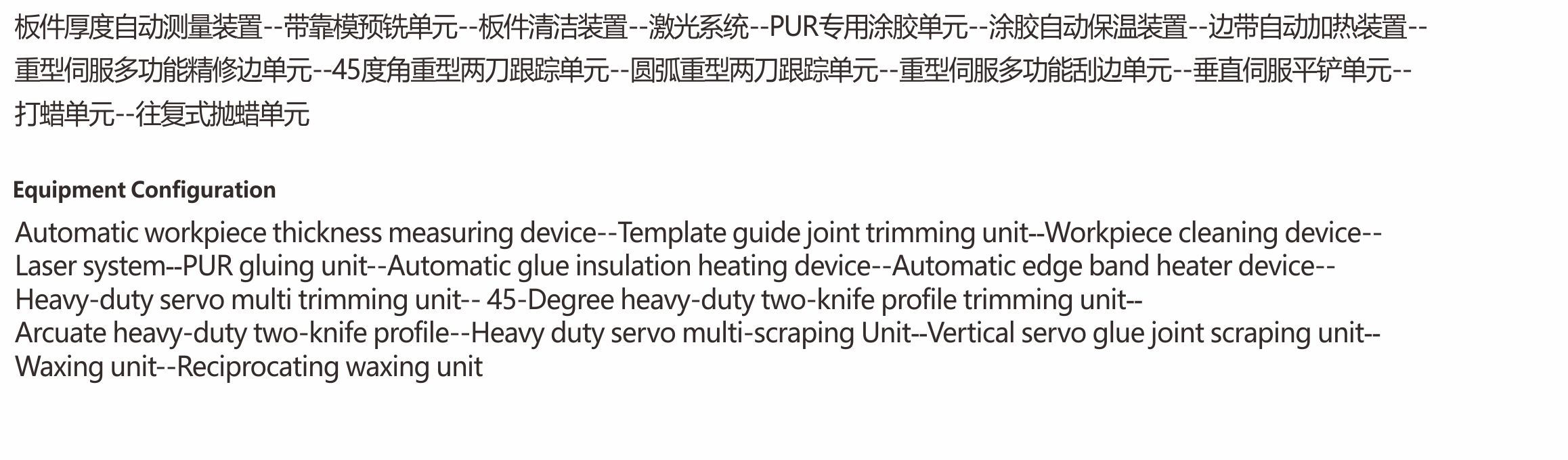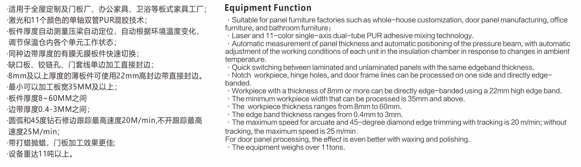 ·適用于板式全屋定制及辦公家具工廠門(mén)板、柜體的PVC、ABS、亞克力、木皮等封邊材質(zhì),寬度在35MM及以上,厚度8~60MM之間的板件加工。 ·自動(dòng)測(cè)量調(diào)節(jié)壓梁高度,板件基材待涂膠面徹底清理后涂膠,避免涂膠軸上頻繁出現(xiàn)殘?jiān)鼘?dǎo)致涂膠不均勻從而影響封邊效果;送帶和壓貼伺服驅(qū)動(dòng)各個(gè)單元工作精度高,修邊、刮刀、平鏟單元垂直伺服調(diào)節(jié),能夠?qū)崿F(xiàn)封邊帶厚度誤差的垂直加工量的快速校正,有膜無(wú)膜板件快速切換及不同膜厚度的快速自動(dòng)補(bǔ)償。可以實(shí)現(xiàn)圓弧修邊跟蹤和45度鉆石修邊跟蹤的快速切換和混合加工,加工速度最高可達(dá) 25M/min,重型兩刀跟蹤最高速度可達(dá)20米M/min,可以一次完成板件的直線封邊和后續(xù)打蠟拋蠟保護(hù)。 ·自帶恒溫房的激光封邊系統(tǒng),免去客戶自己搭空調(diào)房的高能耗、高成本及移動(dòng)設(shè)備位置改變空間布局的不便,同時(shí)減少占地空間,可以實(shí)現(xiàn)對(duì)激光封邊帶的無(wú)縫封邊完美加工。 ·一組單軸雙管多色PUR專用免清洗涂膠系統(tǒng),可以根據(jù)不同的板件基材快速自動(dòng)調(diào)節(jié)對(duì)應(yīng)合適涂膠量,具備夏季膠水快速降溫,冬季板材、膠水、封邊帶及加工過(guò)程自動(dòng)加溫保溫功能,為 PUR 不同氣候溫度下正常工作保駕護(hù)航。 ·機(jī)架采用加厚鋼板焊接制作,經(jīng)過(guò)退火銑平處理,上下鋼梁且下鋼梁及導(dǎo)軌與機(jī)身一體化設(shè)計(jì)精度更高,單元設(shè)計(jì)重型化長(zhǎng)期工作穩(wěn)定性更高,擁有多項(xiàng)國(guó)家專利技術(shù),電氣零部件采用國(guó)際國(guó)內(nèi)知名品牌,保證設(shè)備運(yùn)行持續(xù)穩(wěn)定,加工品質(zhì)完美。 ·重達(dá)11噸以上的大型設(shè)備。