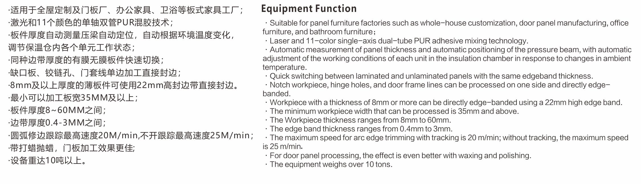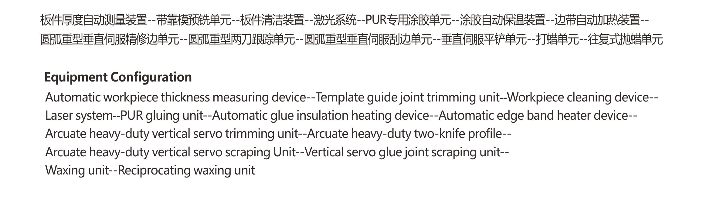 ·適用于板式全屋定制及辦公家具工廠門板、柜體的PVC、ABS、亞克力、木皮等封邊材質(zhì),寬度在35MM及以上,厚度8~60MM之間的板件加工。 ·自動測量調(diào)節(jié)壓梁高度,板件基材待涂膠面徹底清理后涂膠,避免涂膠軸上頻繁出現(xiàn)殘渣導致涂膠不均勻從而影響封邊效果;送帶和壓貼伺服驅(qū)動各個單元工作精度高,修邊、刮刀、平鏟單元垂直伺服調(diào)節(jié),能夠?qū)崿F(xiàn)封邊帶厚度誤差的垂直加工量的快速校正,有膜無膜板件快速切換及不同膜厚度的快速自動補償。加工速度最高可達25M/min,重型兩刀跟蹤最高速度可達20米M/min,可以一次完成板件的圓弧直線封邊和后續(xù)打蠟拋蠟保護。 ·自帶恒溫房的激光封邊系統(tǒng),免去客戶自己搭空調(diào)房的高能耗、高成本及移動設備位置改變空間布局的不便,同時減少占地空間,可以實現(xiàn)對激光封邊帶的無縫封邊完美加工。 ·一組單軸雙管多色PUR專用免清洗涂膠系統(tǒng),可以根據(jù)不同的板件基材快速自動調(diào)節(jié)對應合適涂膠量,具備夏季膠水快速降溫,冬季板材、膠水、封邊帶及加工過程自動加溫保溫功能,為 PUR 不同氣候溫度下正常工作保駕護航。 ·機架采用加厚鋼板焊接制作,經(jīng)過退火銑平處理,上下鋼梁且下鋼梁及導軌與機身一體化設計精度更高,單元設計重型化長期工作穩(wěn)定性更高,擁有多項國家專利技術(shù),電氣零部件采用國際國內(nèi)知名品牌,保證設備運行持續(xù)穩(wěn)定,加工品質(zhì)完美。 ·重達10噸以上的重型設備。