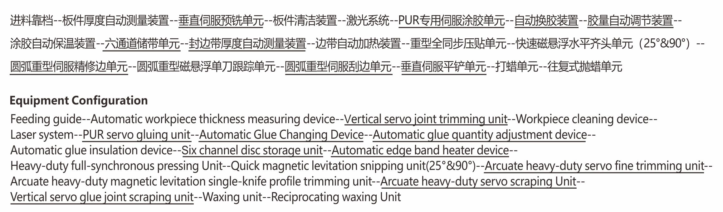 ·適用于板式全屋定制及辦公家具工廠門板、柜體的 PVC、ABS、亞克力、等封邊材質(zhì),寬度在 60MM~100mm 以上,厚度 8~60MM 之間板件。 ·自動(dòng)測量板件厚度誤差變化,調(diào)節(jié)最合適的壓梁高度;封邊帶厚度自動(dòng)測量,根據(jù)封邊帶厚度誤差變化自動(dòng)調(diào)節(jié)修邊、跟蹤、刮刀各個(gè)單元刀具的加工量;預(yù)銑單元刀具伺服自動(dòng)升降,大大提高了預(yù)銑刀使用壽命和工作效率;送帶、壓貼伺服驅(qū)動(dòng),壓帶、修邊、跟蹤、刮刀、平鏟等單元伺服快速調(diào)節(jié)。板件基材待涂膠面徹底清理后涂膠,避免涂膠軸上頻繁出現(xiàn)殘?jiān)鼘?dǎo)致涂膠不均勻從而影響封邊效果,送帶壓貼各個(gè)單元工作精度高,有膜無膜板件快速切換及不同膜厚度的快速自動(dòng)補(bǔ)償。高速磁懸浮水平齊頭加工精度更高的同時(shí)能夠?qū)崿F(xiàn)90度及25度倒棱鋸切,磁懸浮跟蹤刀刃雙向伺服調(diào)節(jié)精度更高,加工速度最高可達(dá)35M/min,可以一次完成板件的圓弧直線封邊和后續(xù)打蠟拋蠟保護(hù)。 ·自帶恒溫房更加節(jié)能先進(jìn)的第二代豪田激光封邊系統(tǒng),免去客戶自己搭空調(diào)房的高能耗、高成本及移動(dòng)設(shè)備位置改變空間布局的不便,同時(shí)減少占地空間,可以實(shí)現(xiàn)對(duì)激光封邊帶的無縫封邊完美加工。 ·一組單軸雙管多色PUR專用伺服免清洗涂膠系統(tǒng),可以根據(jù)封邊帶的顏色變化自動(dòng)切換最合適的膠水顏色,根據(jù)不同基材的變化實(shí)時(shí)調(diào)節(jié)涂膠量大小。具備夏季膠水快速降溫,冬季板材、膠水、封邊帶及加工過程加溫保溫功能,為PUR不同氣候溫度下正常工作保駕護(hù)航。 ·機(jī)架采用加厚鋼板焊接制作,經(jīng)過退火銑平處理,上下鋼梁且下鋼梁及導(dǎo)軌與機(jī)身一體化設(shè)計(jì)精度更高,單元設(shè)計(jì)重型化長期工作穩(wěn)定性更高,擁有多項(xiàng)國家專利技術(shù),電氣零部件采用國際國內(nèi)知名品牌,保證設(shè)備運(yùn)行持續(xù)穩(wěn)定,加工品質(zhì)完美。 ·重達(dá)12噸以上的重型設(shè)備。