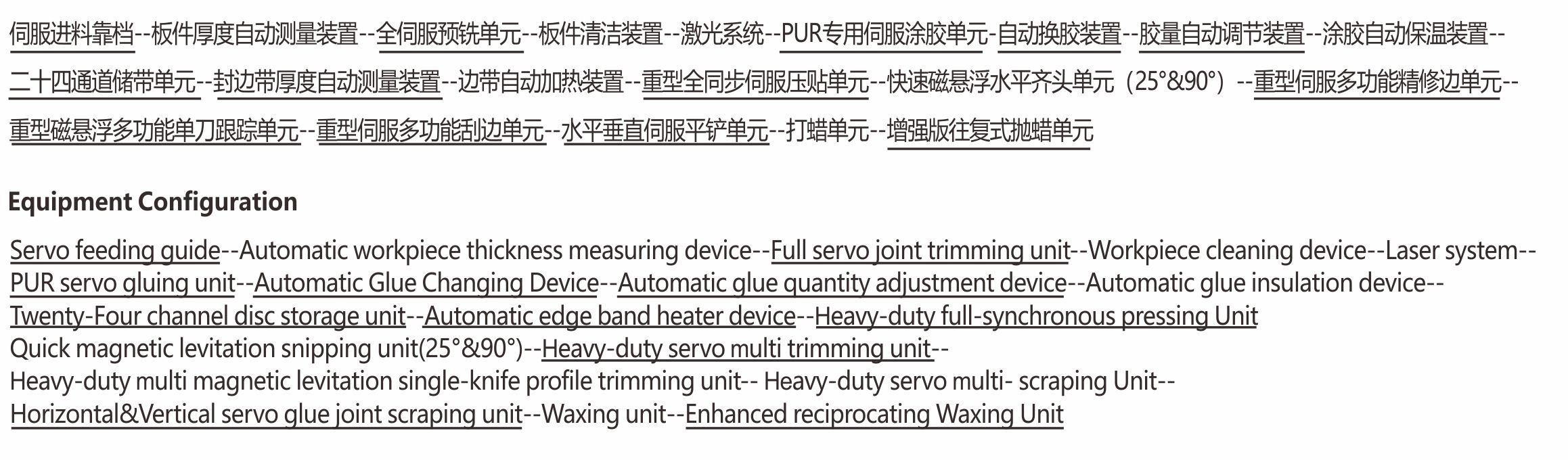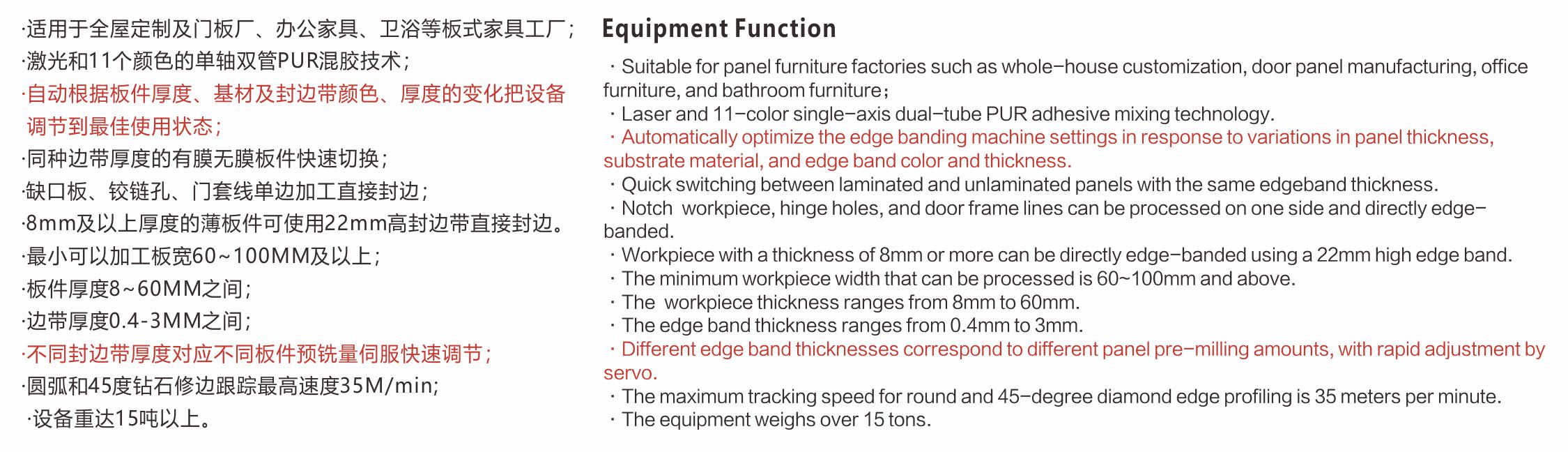 ·適用于板式全屋定制及辦公家具工廠門板、柜體的 PVC、ABS、亞克力、等封邊材質(zhì),寬度在 60MM~100mm 以上,厚度 8~60MM 之間板件。 ·自動測量調(diào)節(jié)壓梁高度,不同的封邊帶厚度自動測量篩選和制作最佳加工配方,板件預(yù)銑量快速伺服調(diào)節(jié),高速水平齊頭加工精度更高同時能夠?qū)崿F(xiàn)90度及25度倒棱鋸切,送帶、壓貼伺服驅(qū)動,壓帶、修邊、跟蹤、刮刀、平鏟等單元伺服快速調(diào)節(jié),板件基材待涂膠面徹底清理后涂膠,避免涂膠軸上頻繁出現(xiàn)殘渣導(dǎo)致涂膠不均勻從而影響封邊效果,送帶壓貼各個單元工作精度高,能夠?qū)崿F(xiàn)有膜無膜板件快速切換,分色加工多組圓弧修邊跟蹤,同時也可以快速切換成45度鉆石修邊跟蹤倒角,磁懸浮單刀高速跟蹤加工速度最高可達(dá)35M/min,一次性完成板件的直線封邊和后續(xù)打蠟拋蠟保護(hù)。 ·自帶恒溫房的激光封邊系統(tǒng),免去客戶自己搭空調(diào)房的高能耗、高成本及移動設(shè)備位置改變空間布局的不便,同時減少占地空間。 ·單軸雙管多色PUR專用伺服免清洗涂膠系統(tǒng),可以根據(jù)不同的板件基材快速自動調(diào)節(jié)對應(yīng)合適涂膠量,具備夏季膠水快速降溫,冬季板材、膠水、封邊帶及加工過程自動加溫保溫功能,為PUR不同氣候溫度下正常工作保駕護(hù)航。 ·機(jī)架采用加厚鋼板焊接制作,經(jīng)過退火銑平處理,上下鋼梁且下鋼梁及導(dǎo)軌與機(jī)身一體化設(shè)計精度更高,單元設(shè)計重型化長期工作穩(wěn)定性更高,擁有多項國家專利技術(shù),電氣零部件采用國際國內(nèi)知名品牌,保證設(shè)備運行持續(xù)穩(wěn)定,加工品質(zhì)完美。 ·重達(dá)15噸以上的重型設(shè)備。